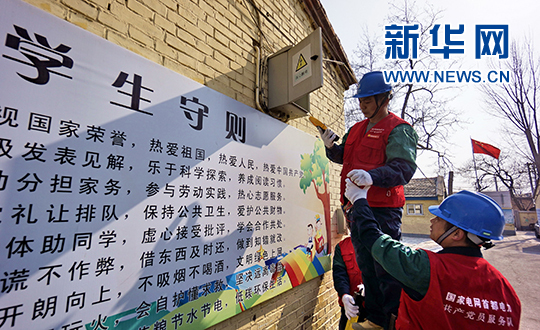 圖為國網(wǎng)北京海淀供電公司的黨員服務隊的技術人員在上莊振興小學檢修供電線路。(3月3日攝)