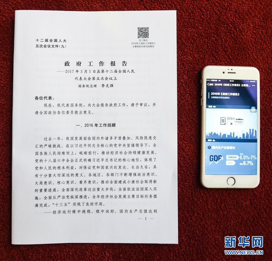 這份“互聯(lián)網(wǎng)+”的政府工作報(bào)告,讓很多人感覺(jué)到了便捷。新華社記者王建華 攝 這是3月5日拍攝的首次印上二維碼的政府工作報(bào)告文本(左)和手機(jī)掃描出的政府工作報(bào)告文本中有關(guān)主要指標(biāo)任務(wù)完成情況的各項(xiàng)數(shù)據(jù)。今年政府工作報(bào)告文本上首次印上二維碼,并附有文字說(shuō)明:“掃二維碼 2016年《政府工作報(bào)告》主要指標(biāo)任務(wù)完成情況”。用手機(jī)掃描二維碼,會(huì)掃出政府工作報(bào)告中有關(guān)主要指標(biāo)任務(wù)完成情況的各項(xiàng)數(shù)據(jù)。