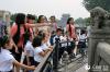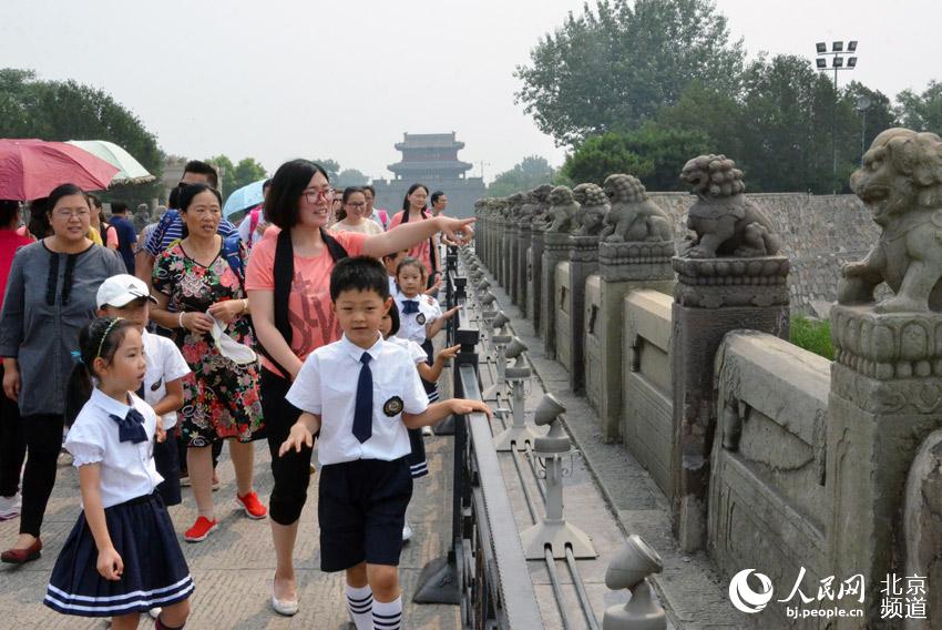 在盧溝橋頭,老師們與孩子們一起數(shù)獅子,給他們講述80年前這里發(fā)生的一幕幕場(chǎng)景。人民網(wǎng)尹星云 攝 -