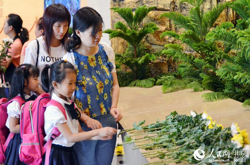 畢業(yè)典禮中,家長(zhǎng)和孩子們向抗戰(zhàn)英雄雕像鮮花,表達(dá)自己的敬意與懷念之情。人民網(wǎng)尹星云 攝 -