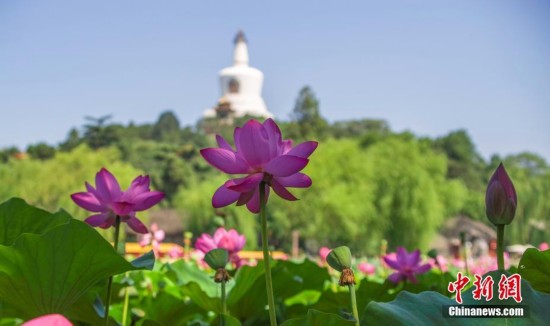 7月7日,北京結(jié)束了連日的陰雨天氣,北海公園內(nèi)的荷花在陽光下盛開。 中新社記者 賈天勇 攝