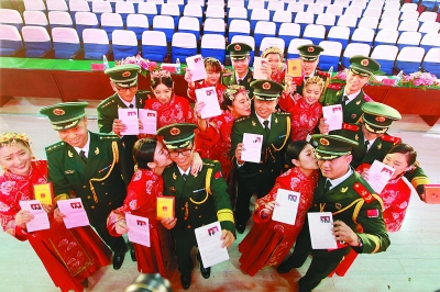 今天上午,朝陽區(qū)舉辦“為愛堅守”軍人專場婚姻登記頒證儀式,9對新人在親友和嘉賓的祝福聲中,正式結(jié)為連理;顒蝇F(xiàn)場朝陽區(qū)民政局還啟動了軍人綠色通道,專門窗口將為軍人提供快速登記、婚前心理疏導(dǎo)等服務(wù)。本報記者 甘南攝 左穎文