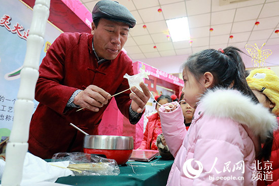 傳統(tǒng)小吃區(qū)包含糖葫蘆、關(guān)東糖、棉花糖、臘八粥、年糕、糖畫和吹糖人。孩子們在大快朵頤的同時還全面了解了各種美食的制作過程。王杰攝