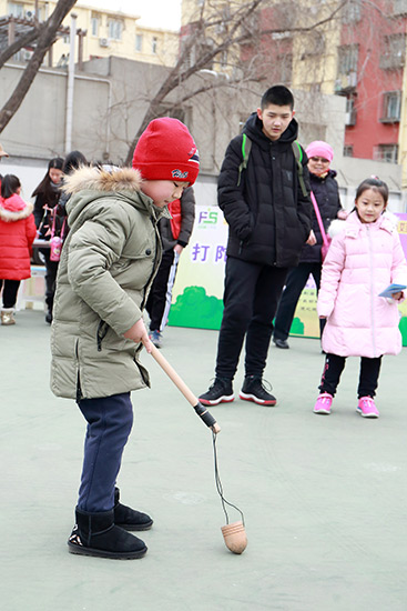室外活動區(qū)包含打陀螺、推鐵環(huán)、投壺、套圈、空竹、跳房子。王杰攝