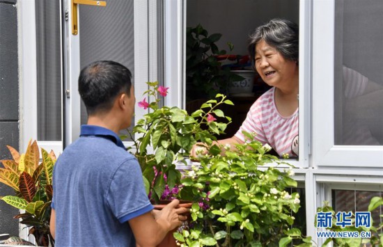 7月4日,社區(qū)工作人員在盧溝橋北里小區(qū)給李玉英(右)老人講解花卉種植知識(shí)。當(dāng)日,北京市豐臺(tái)區(qū)宛平地區(qū)街道開(kāi)展社區(qū)“最美陽(yáng)臺(tái)”評(píng)選和鮮花認(rèn)養(yǎng)活動(dòng),盧溝橋北里小區(qū)居民認(rèn)養(yǎng)了二百多盆適合陽(yáng)臺(tái)種植的茉莉花、三角梅、龍血樹(shù)等花卉,志愿者還為居民進(jìn)行園藝培訓(xùn)。新華社記者李欣攝