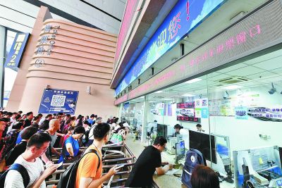 北京南站增設(shè)退票窗口,10日,受臺(tái)風(fēng)“利奇馬”影響,北京南站多趟高鐵列車(chē)停運(yùn),售票窗口的大屏幕滾動(dòng)顯示退票改簽公告,站內(nèi)增設(shè)多個(gè)退票和改簽窗口,以減少乘客損失。本報(bào)記者 和冠欣