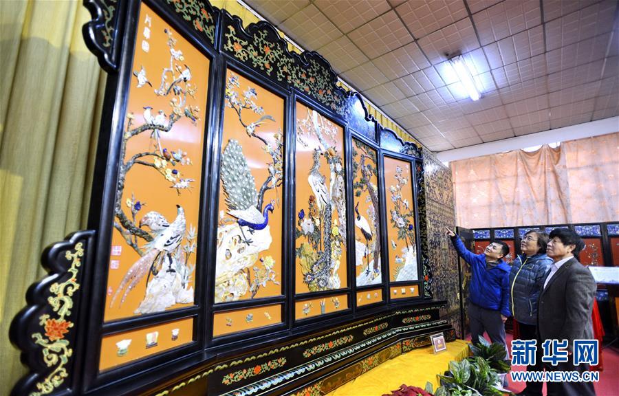 11月9日,觀眾在欣賞展出的大型玉雕精工矯嵌屏風“丹鳳圖”。