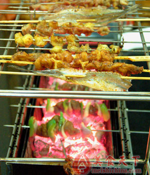 食客自己將烤串放置在店家特別設(shè)計的烤爐上,隨著鏈條的滾動烤串便會自動翻滾,均勻烤熟?竞煤罂梢詫⒖敬茉跔t子的上層,這樣既能保溫又不至于使食物烤焦。小編認為這樣烤出來的食物受熱非常均勻,外焦里嫩,比一般店里師傅烤出來的還要好。