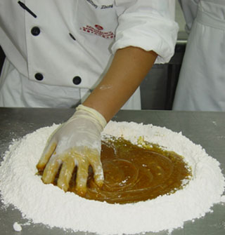 面粉、糖漿、橄欖油、堿水、吉士粉混合攪拌成皮