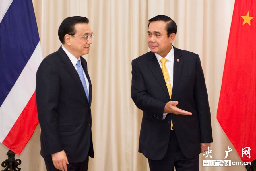 央廣網(wǎng)曼谷12月19日消息(記者劉樂 李思默)李克強總理19日下午在曼谷會見泰國總理巴育。他們共同見證了中泰鐵路和農(nóng)產(chǎn)品合作諒解備忘錄的簽署。這兩個備忘錄是去年兩國所簽相關(guān)協(xié)議的擴充、延伸和進一步確認。李克強說兩國將在泰建設(shè)長達800公里的首條標準軌鐵路,這將有利于整個地區(qū)互聯(lián)互通。