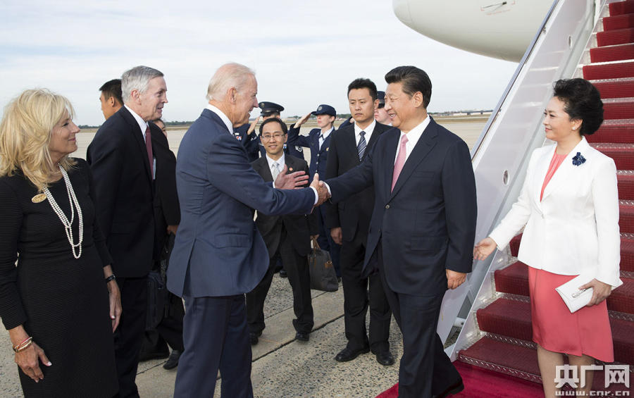 下午5時(shí)40分許,習(xí)近平乘坐的專(zhuān)機(jī)抵達(dá)華盛頓安德魯斯空軍基地。美國(guó)副總統(tǒng)拜登和夫人專(zhuān)程來(lái)到機(jī)場(chǎng),熱情歡迎習(xí)近平和夫人彭麗媛。美國(guó)兒童向習(xí)近平夫婦獻(xiàn)花。禮兵分列紅地毯兩側(cè)。軍樂(lè)隊(duì)奏響中美兩國(guó)國(guó)歌。