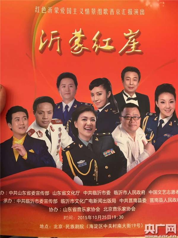 《沂蒙紅崖》晉京演出由中共山東省委宣傳部、山東省文化廳、中共臨沂市委、臨沂市人民政府與中國文藝志愿者協(xié)會共同主辦;中共臨沂市委宣傳部、臨沂市文化廣電新聞出版局、中共莒南縣委、莒南縣人民政府承辦;山東省音樂家協(xié)會、北京音樂家協(xié)會協(xié)辦,來自首都各界的社會人士1000多人觀看了本場演出。