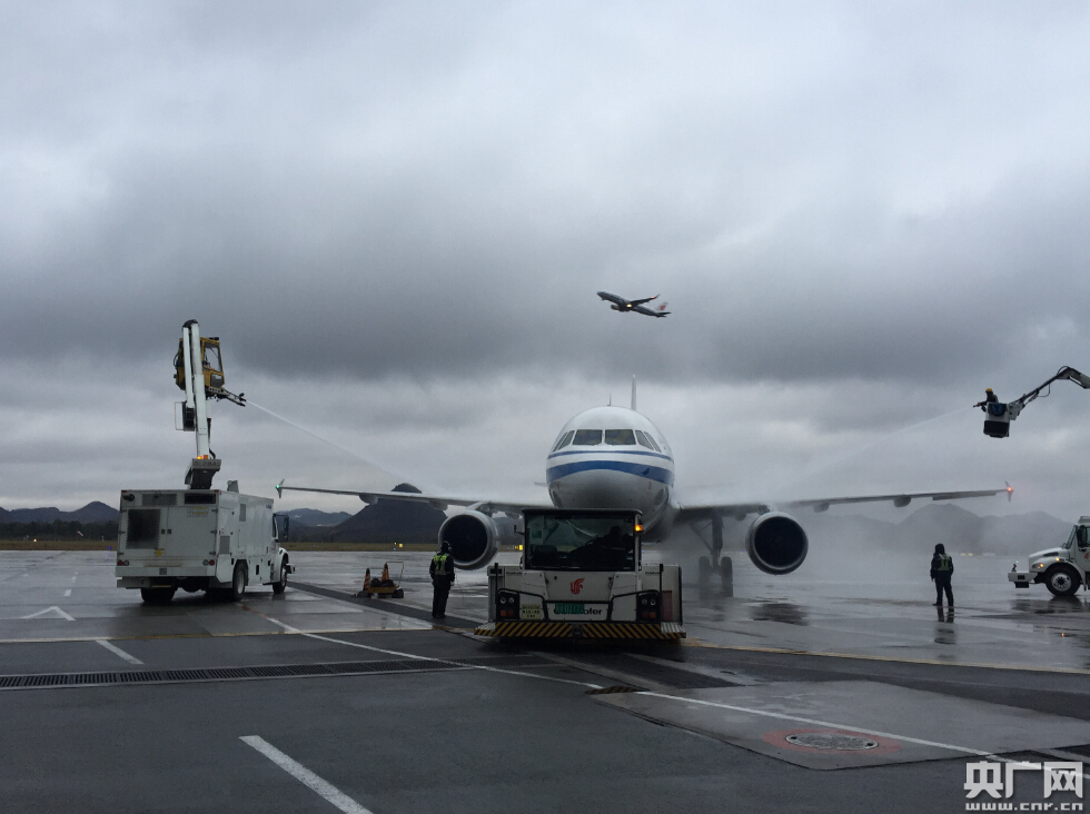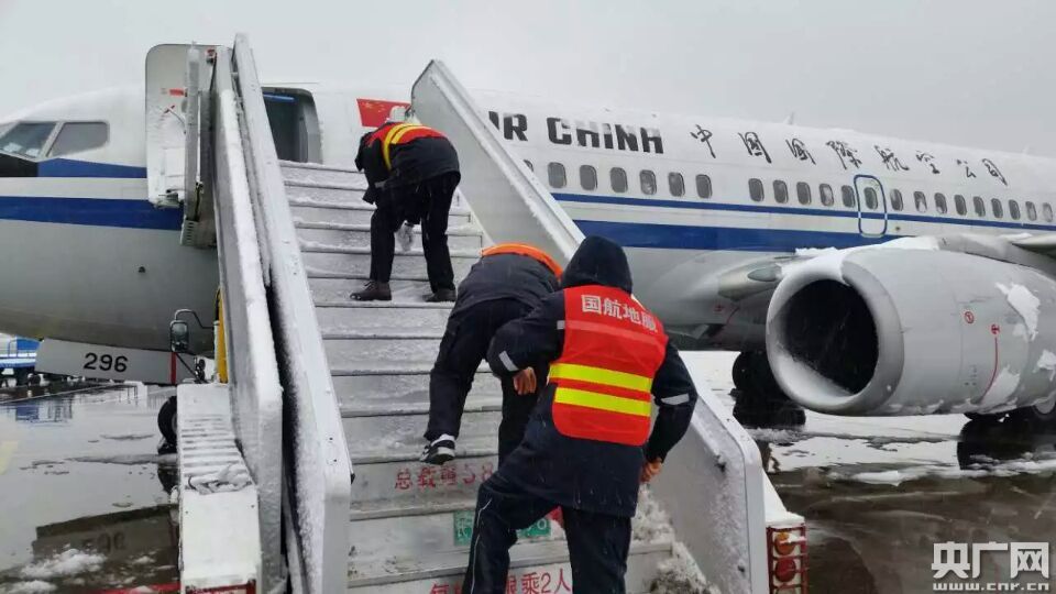 國(guó)航機(jī)務(wù)正在為飛機(jī)進(jìn)行除冰作業(yè)。何芝奉攝