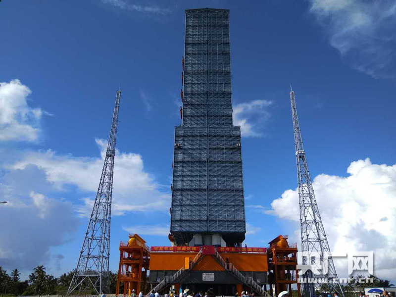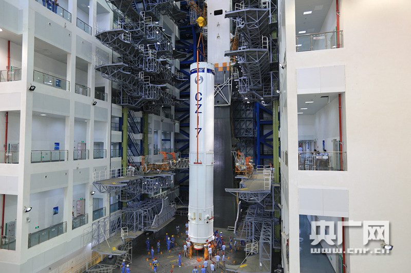 5月22日,長(zhǎng)征七號(hào)火箭在垂直總裝測(cè)試廠房總裝。 -