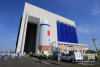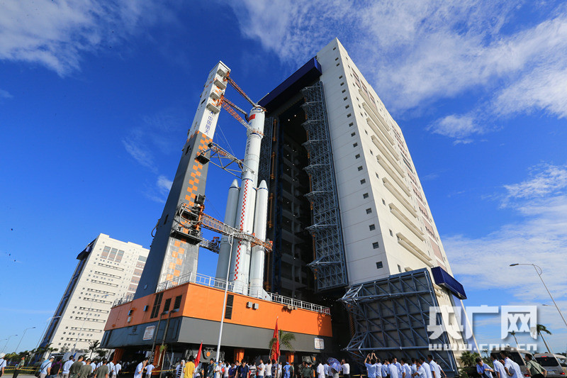 長(zhǎng)征七號(hào)火箭緩緩移出垂直總裝測(cè)試廠房。 -