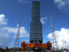 運(yùn)輸火箭的車隊(duì)駛?cè)牒D衔牟教彀l(fā)射場(chǎng)。 -