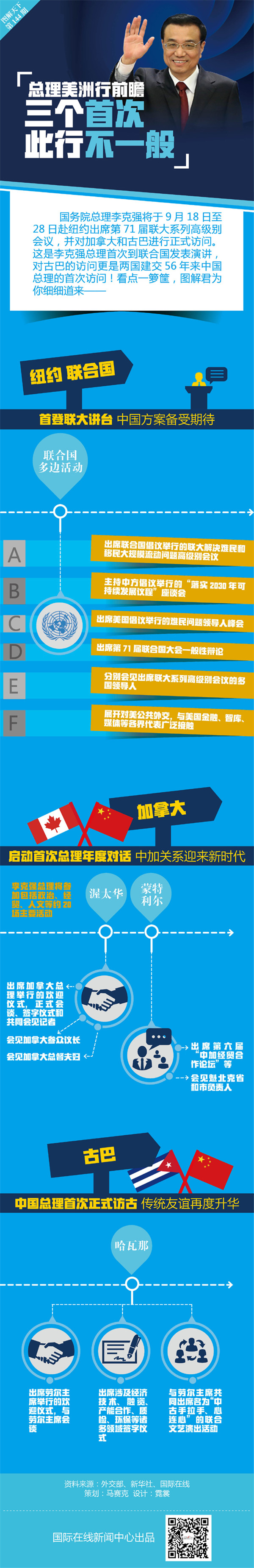 央廣網(wǎng)北京9月18日消息(記者馬喆)李克強18日下午乘專機離京,赴紐約聯(lián)合國總部出席第71屆聯(lián)合國大會系列高級別會議,并對加拿大和古巴進行正式訪問。這是總理本月第二次出訪行程,也將創(chuàng)下三個“首次”:李克強總理首次登上聯(lián)大講臺,中國總理13年來首訪加拿大,以及中國總理首次訪問古巴。