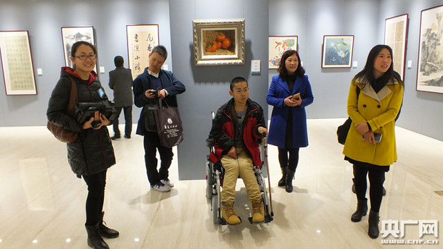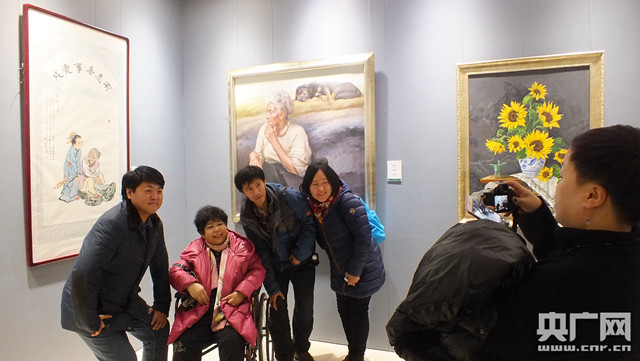 書畫作者(圖中坐輪椅者)在自己的作品前準(zhǔn)備向參觀者做展示介紹