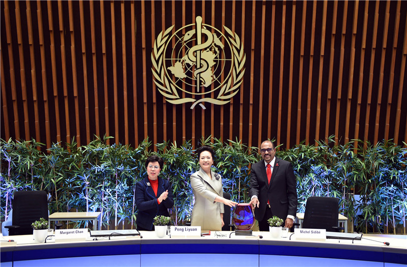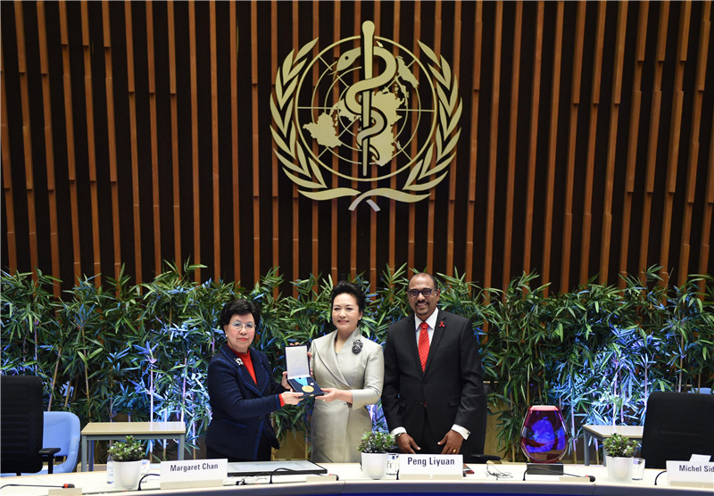 1月18日,國(guó)家主席習(xí)近平夫人、世界衛(wèi)生組織結(jié)核病和艾滋病防治親善大使彭麗媛應(yīng)世界衛(wèi)生組織總干事陳馮富珍和聯(lián)合國(guó)艾滋病規(guī)劃署執(zhí)行主任西迪貝邀請(qǐng),在瑞士日內(nèi)瓦出席為她舉行的親善大使任期續(xù)延暨頒獎(jiǎng)儀式。這是世界衛(wèi)生組織總干事陳馮富珍向彭麗媛頒發(fā)世衛(wèi)組織榮譽(yù)勛章。(新華社記者謝環(huán)馳攝)
