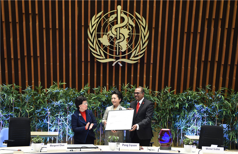 1月18日,國(guó)家主席習(xí)近平夫人、世界衛(wèi)生組織結(jié)核病和艾滋病防治親善大使彭麗媛應(yīng)世界衛(wèi)生組織總干事陳馮富珍和聯(lián)合國(guó)艾滋病規(guī)劃署執(zhí)行主任西迪貝邀請(qǐng),在瑞士日內(nèi)瓦出席為她舉行的親善大使任期續(xù)延暨頒獎(jiǎng)儀式。這是世界衛(wèi)生組織總干事陳馮富珍向彭麗媛頒發(fā)親善大使任期續(xù)延證書。(新華社記者謝環(huán)馳攝)