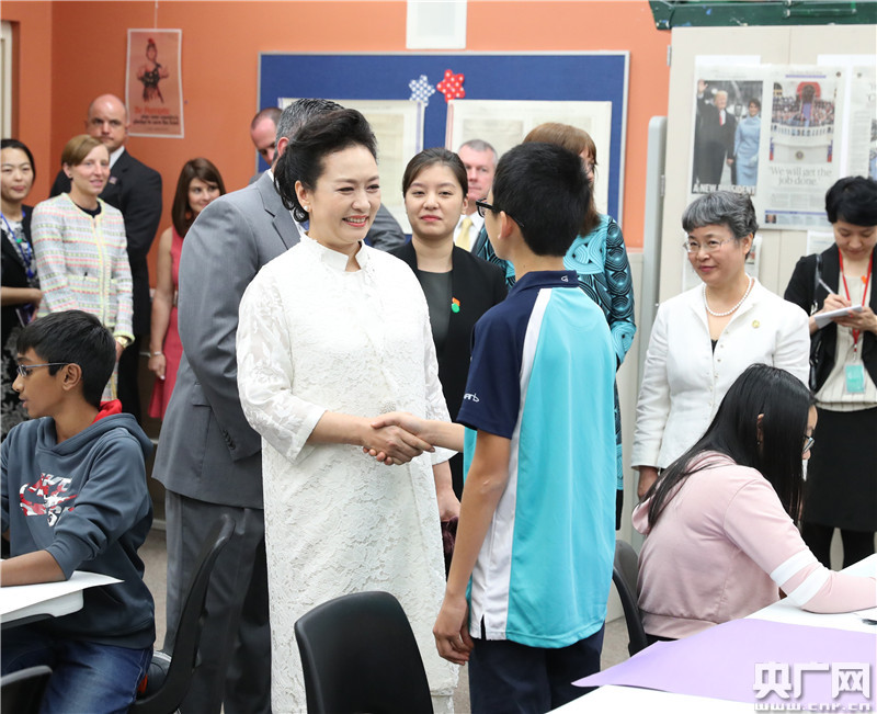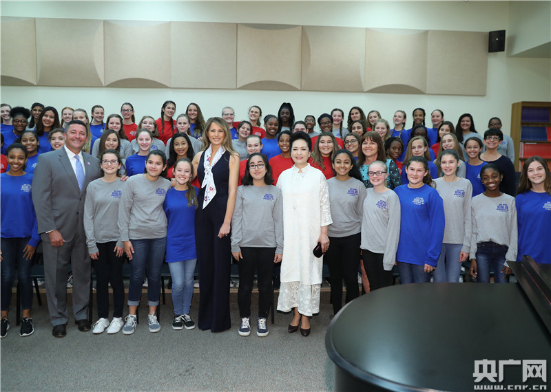 彭麗媛抵達(dá)時(shí),梅拉尼婭和棕櫚灘郡學(xué)區(qū)長阿沃莎、巴克藝術(shù)中學(xué)校長羅贊基等在停車處熱情迎接。彭麗媛先后參觀了聲樂教室、交響樂隊(duì)教室、弦樂教室,欣賞學(xué)生演唱和樂隊(duì)表演,并同學(xué)生們親切互動(dòng)交流。隨后,彭麗媛觀摩了時(shí)政經(jīng)濟(jì)課,回答了學(xué)校小記者關(guān)于“你和藝術(shù)的淵源”的提問,并接受了學(xué)生自己創(chuàng)作的水彩畫。彭麗媛表示,中美兩國可以加強(qiáng)藝術(shù)交流合作。希望巴克藝術(shù)中學(xué)的老師和同學(xué)們以教育和藝術(shù)為橋梁,為增進(jìn)中美兩國人民友好、推動(dòng)兩國關(guān)系發(fā)展作出更多貢獻(xiàn)。
