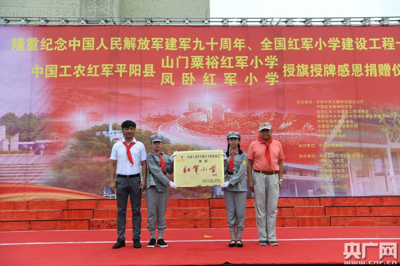 6月20日,為紀(jì)念中國(guó)人民解放軍建軍九十周年、全國(guó)紅軍小學(xué)建設(shè)工程十周年,全國(guó)紅軍小學(xué)建設(shè)工程理事會(huì)在浙江革命老區(qū)平陽(yáng)縣山門鳳臥兩鎮(zhèn)分別舉行粟裕紅軍小學(xué)、鳳臥紅軍小學(xué)授旗授牌感恩捐贈(zèng)儀式。平陽(yáng)縣地處浙江東南之隅,是擁有光輝革命歷史的老根據(jù)地縣,被譽(yù)為“浙江延安”。在革命歷史年代,平陽(yáng)縣曾是中共閩浙邊臨時(shí)邊委、紅軍挺進(jìn)師的活動(dòng)中心,也是中共浙江省委的發(fā)源地。1939年,浙江“省委一大”在平陽(yáng)鳳臥召開(kāi),劉英、粟裕等老一輩革命家曾帶領(lǐng)紅軍挺進(jìn)師在這里堅(jiān)持三年游擊戰(zhàn)爭(zhēng),為中國(guó)革命事業(yè)作出了巨大的犧牲和貢獻(xiàn)。鳳臥紅軍小學(xué)始建于1998年,是我國(guó)改革開(kāi)放后由人民政府在革命老區(qū)建設(shè)的第一所紅軍小學(xué)。