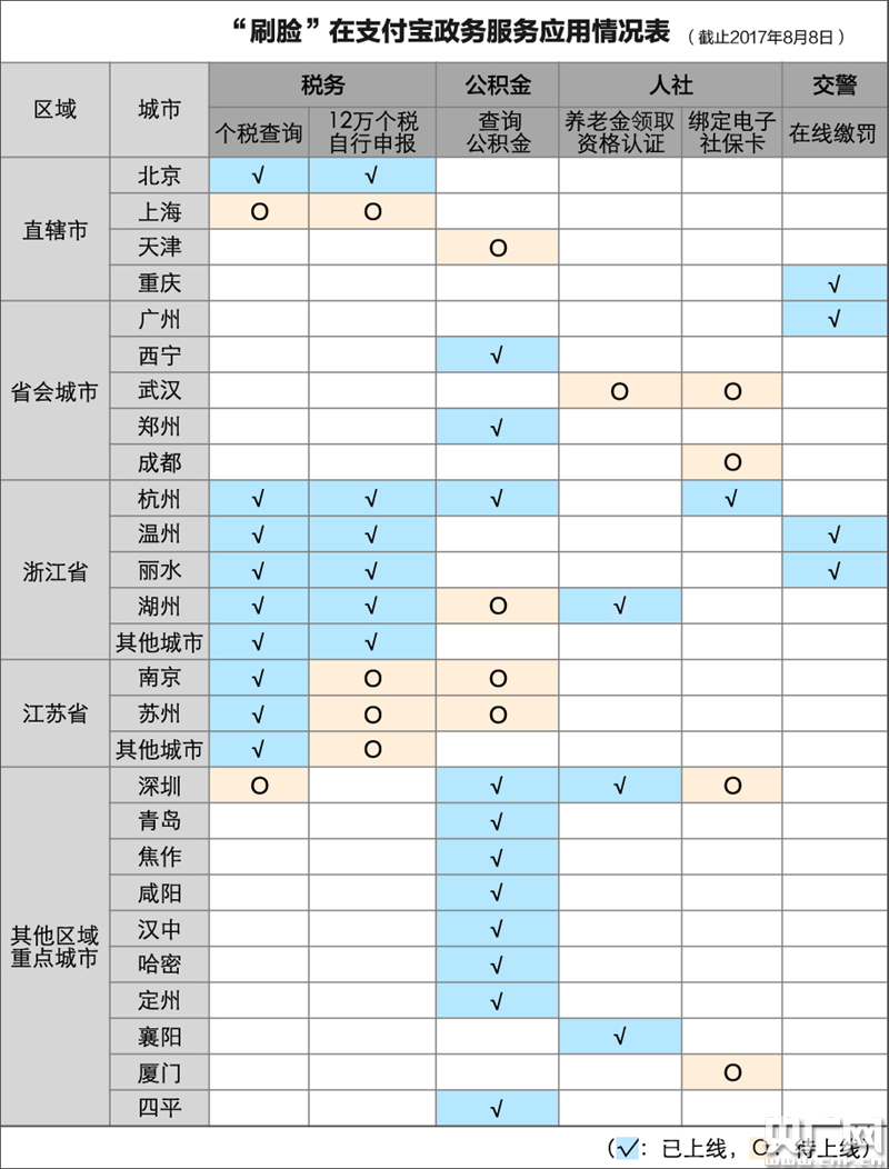 8月8日,江蘇省地稅局在全省正式上線支付寶刷臉查個(gè)稅服務(wù)。至此,全國已有40個(gè)城市都開通了“刷臉政務(wù)”,覆蓋的服務(wù)類別包括查詢公積金,繳納交通罰單,個(gè)稅申報(bào)等,最近三個(gè)月,已有超過875萬用戶,嘗試坐在家里刷個(gè)臉,完成信用認(rèn)證,就完成了政務(wù)辦理,F(xiàn)在用戶只需要在支付寶里搜索“刷臉”,還能看到自己所在城市已經(jīng)支持刷臉認(rèn)證的所有政務(wù)服務(wù)。