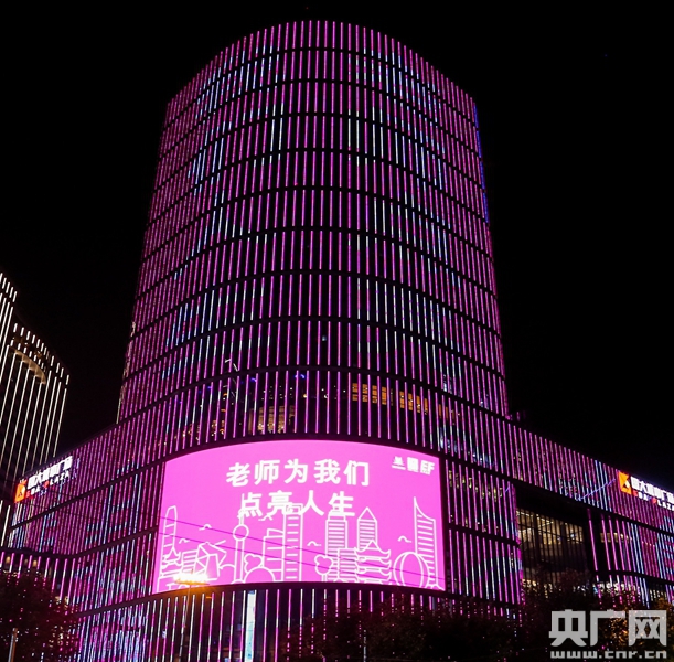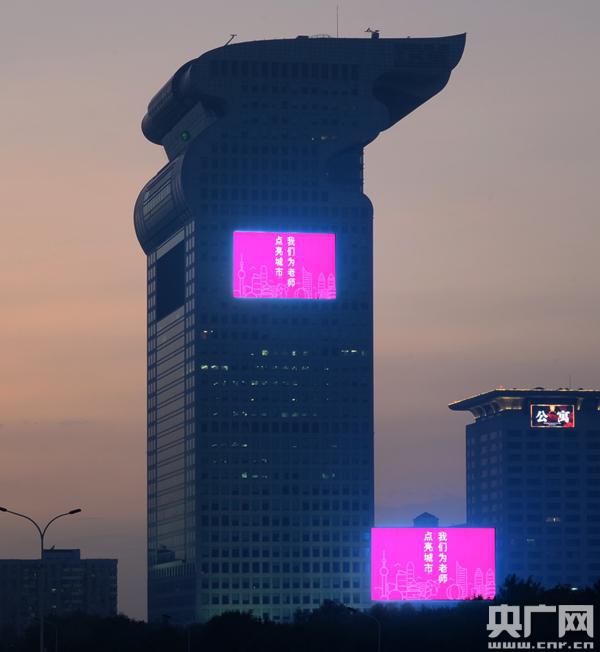 央廣網(wǎng)北京9月11日消息(記者馮會(huì)玲)在中國教師發(fā)展基金會(huì)的倡議下,北京盤古大觀、上海中心、杭州武林廣場(chǎng)BIG PAD、重慶環(huán)球金融中心為代表的城市地標(biāo)建筑紛紛響應(yīng)“亮燈”公益行動(dòng),在9月10日晚8點(diǎn)在建筑樓身打出“老師為我們點(diǎn)亮人生,我們?yōu)槔蠋燑c(diǎn)亮城市”的字樣。