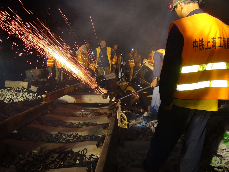 施工人員進行切割鋼軌作業(yè)。 杜智儒 攝