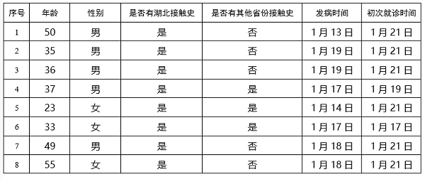 北京市衛(wèi)生健康委員會(huì)統(tǒng)計(jì),這8名患者分別在1月13日-19日發(fā)病,1月17日-21日就診,發(fā)病與就診之間分別相隔0-8天。