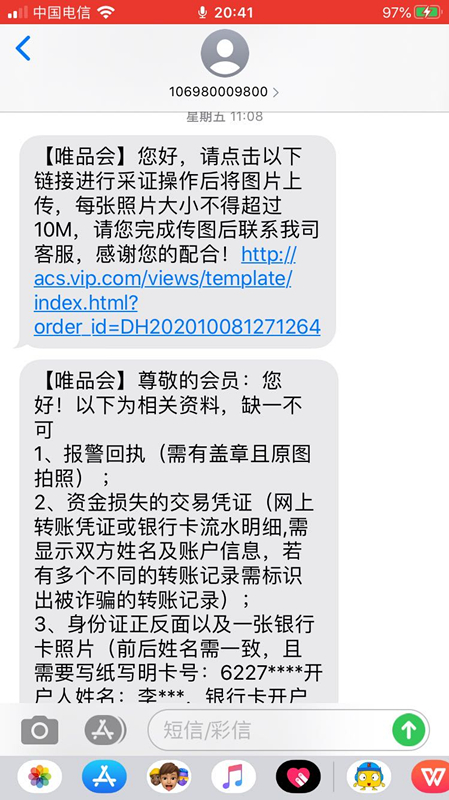 被騙后,受害者除了第一時(shí)間向警方報(bào)案外,還與唯品會(huì)聯(lián)絡(luò),質(zhì)疑其為何會(huì)把自己的隱私泄露?幾位受害人告訴記者,在他們向唯品會(huì)提交手持身份證照片等隱私數(shù)據(jù)后,唯品會(huì)向部分被騙用戶“墊付”了損失,并要求他們承諾,一旦警方破案拿到被騙款項(xiàng),返還墊付款項(xiàng)。但李女士認(rèn)為,把手持身份證照片給到唯品會(huì),無疑又增加了一層隱私泄露的風(fēng)險(xiǎn)。李女士說:“承諾書的話就是本人身份證號(hào)、聯(lián)系電話、地址,本人在唯品會(huì)購(gòu)物后,因輕信不法分子遭遇網(wǎng)絡(luò)詐騙,本人損失為多少。本人于幾月幾日向警方報(bào)案,報(bào)警回執(zhí),現(xiàn)在唯品會(huì)從客戶體驗(yàn)角度出發(fā),預(yù)先向本人墊付,后面就是本人向唯品會(huì)承諾,如警方后續(xù)追款成功,本人將向唯品會(huì)退還警方追款成功的金額,否則唯品會(huì)有權(quán)通過法律途徑向本人予以追索全部墊付款。承諾人身份證號(hào)這些。”