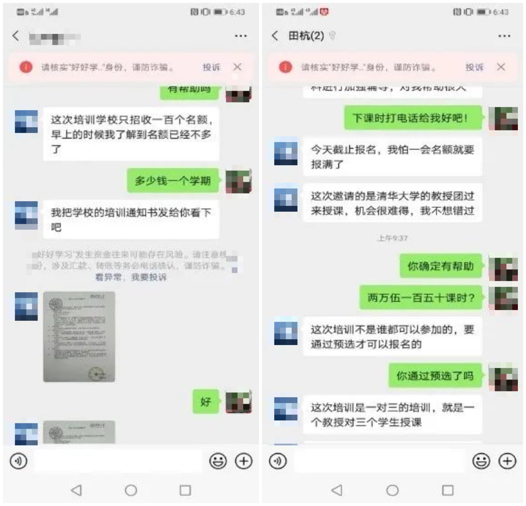 同樣是在上個月,安徽合肥的張女士一天在上班時收到了一條自稱是自己孩子的QQ信息,由于工作忙,張女士同樣沒想太多。在添加QQ好友后,對方稱當地教育局邀請到清華大學資深教授到學校培訓,自己通過篩選得到了寶貴的培訓名額,急需交一筆4萬元的報名費。張女士說:“他當時說,‘媽,我是誰誰誰,’我就以為他是我家的孩子。然后因為錢有點多,我一直沒想著報,但是今天下午3點就截止了。”