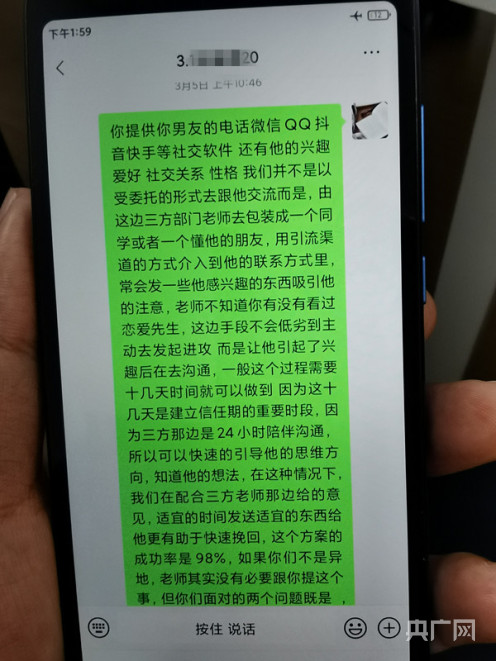 據(jù)了解,這些假冒的“情感分析大師”會(huì)根據(jù)主觀認(rèn)定的被害人情感挽回難易程度,提供所謂量身制定的挽回方案,少則幾千元,多則上萬(wàn)元。過(guò)程中,團(tuán)伙要求被害人不得主動(dòng)聯(lián)系對(duì)方,從而利用被害人與對(duì)方無(wú)法溝通的情況,偽造與對(duì)方的聊天記錄截圖,謊稱正在做對(duì)方工作,繼而編造對(duì)方已有新戀情等虛假信息,來(lái)表明該團(tuán)伙工作“卓有成效”,從而不斷堅(jiān)定被害人信心,誘騙被害人持續(xù)轉(zhuǎn)賬升級(jí)服務(wù)項(xiàng)目。谷峰告訴記者,實(shí)際上,該團(tuán)伙從未與任何被害人的前任取得聯(lián)系,“等到被害人交付第一筆錢(qián)之后,犯罪分子就會(huì)利用被害人想止損或者是我既然已經(jīng)投錢(qián)了就把事情繼續(xù)做下去的心理。因?yàn)樗麄円矔?huì)跟被害人約定,一旦交錢(qián)就不允許再跟自己的前任有任何聯(lián)系,如果有聯(lián)系,那么他們的合同就可能作廢,如果說(shuō)起不到情感挽回的作用,這個(gè)責(zé)任在被害人這里。所以就導(dǎo)致被害人可能就想既然我已經(jīng)投錢(qián)了,我就繼續(xù)投點(diǎn)錢(qián),抱著一個(gè)有一絲希望的期待,讓自己進(jìn)一步踏入了深淵!