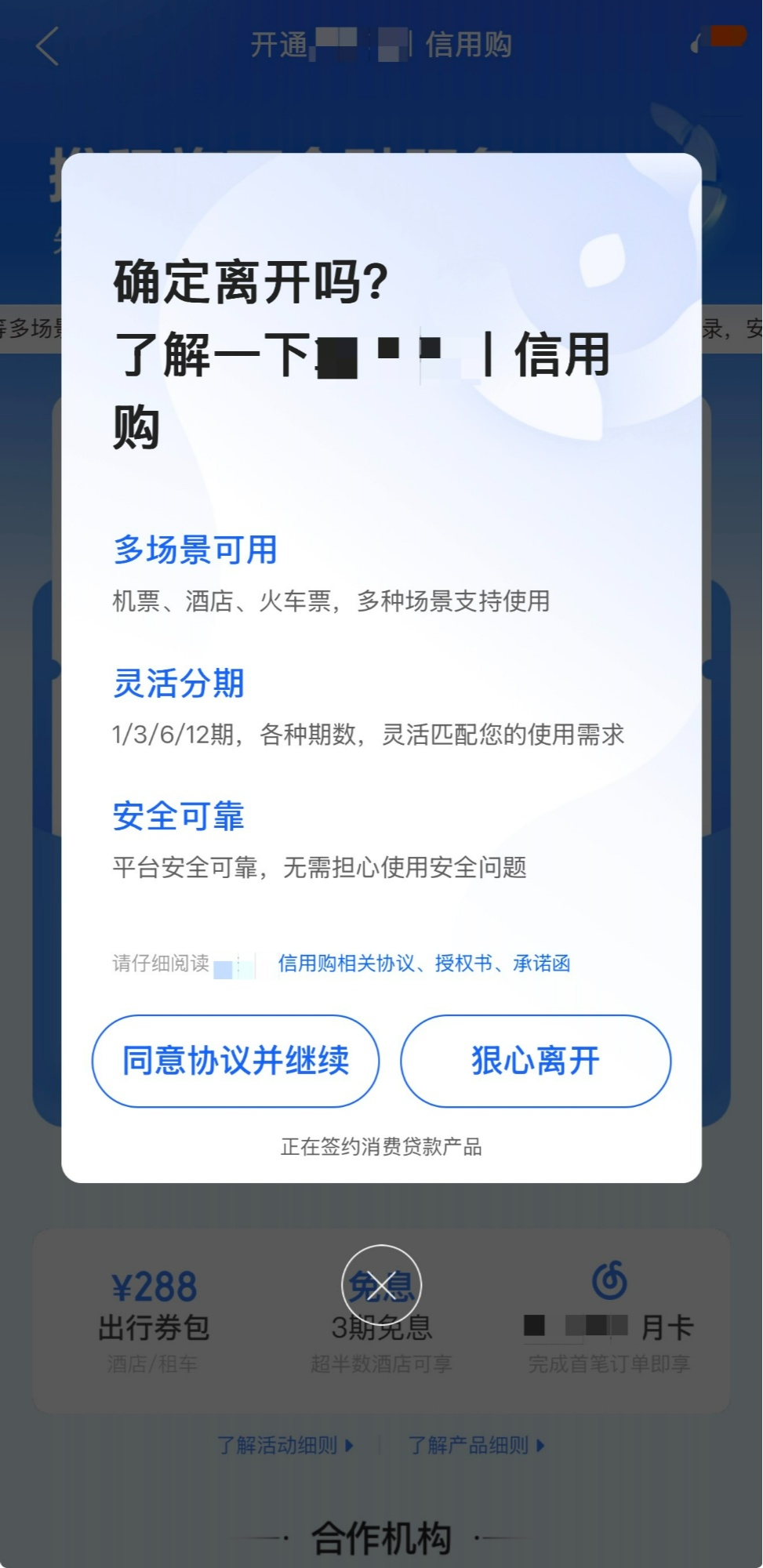 某商旅App的貸款界面退出提醒