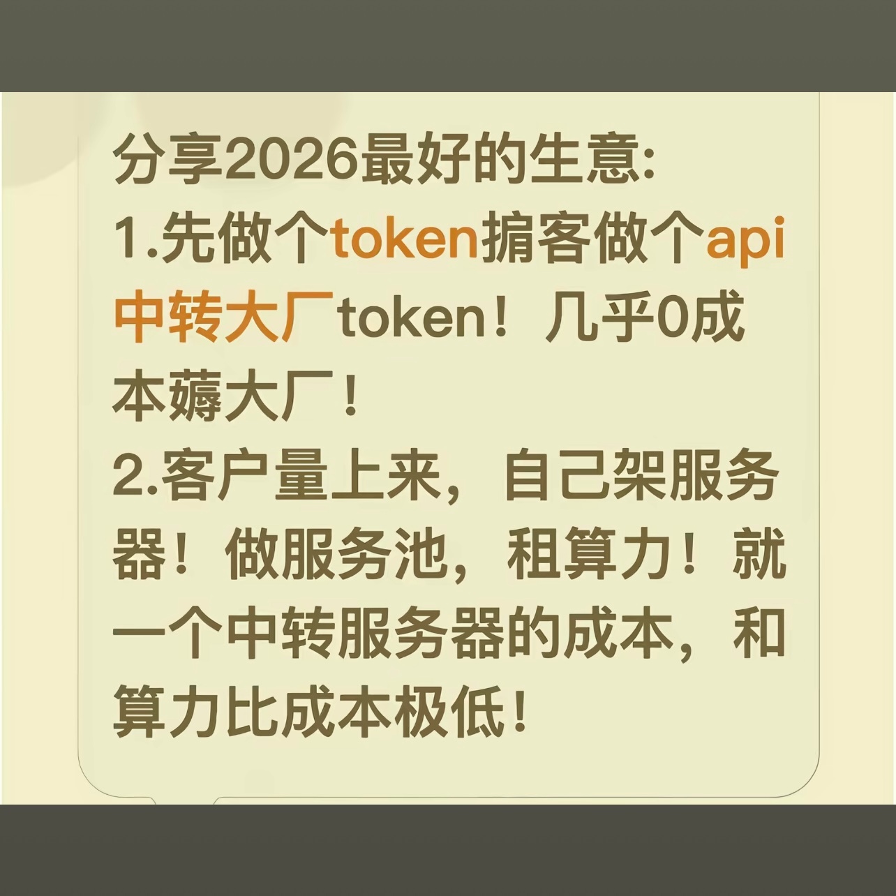 也有博主坦言,做“詞元”代理,賣應(yīng)用程序編程接口賺錢實際上就是“韭菜盤”。“官方接口又便宜又穩(wěn)定,人家憑什么買你的?你既沒有自己研發(fā)底層模型的能力,也沒有獨家的客戶渠道,你就是一個純粹沒有附加值的中間商;大廠一旦宣布免費,你的庫存瞬間變成一堆廢紙,任何人跟你談Token代理和銷售的,就是要割你!
