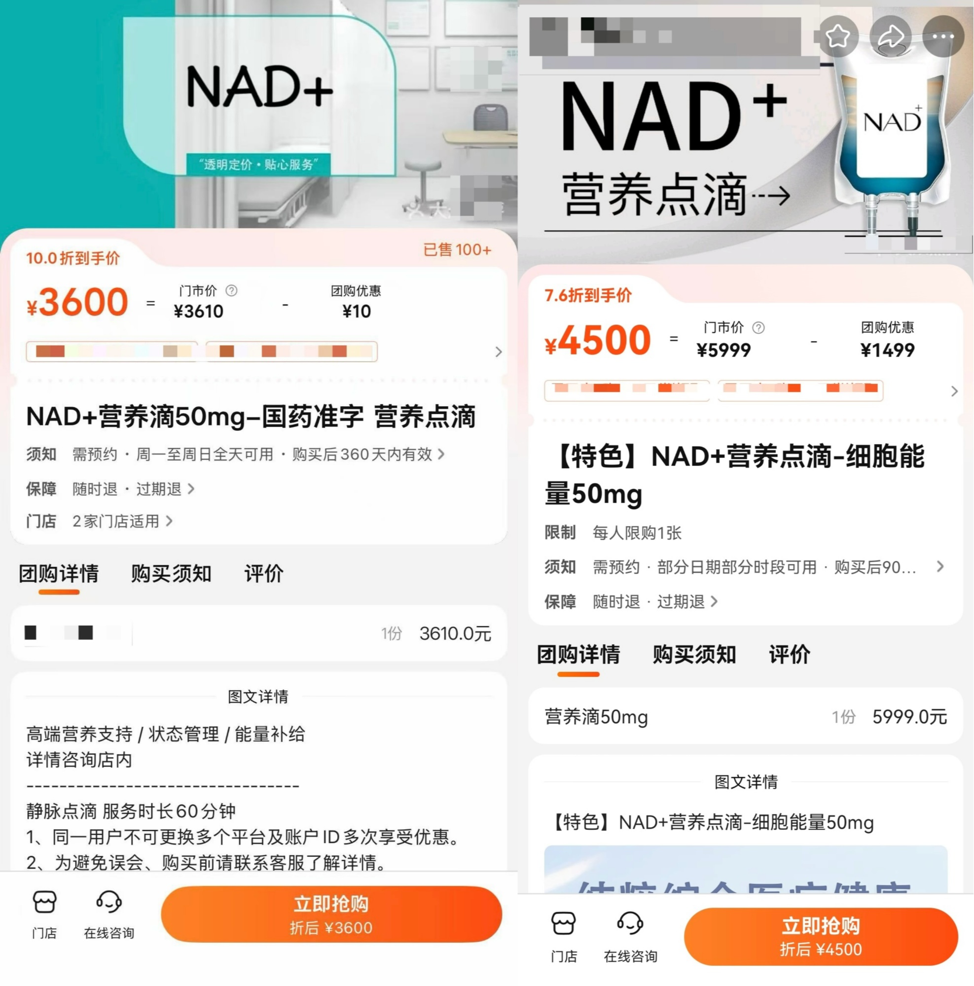 記者在某消費(fèi)點(diǎn)評(píng)網(wǎng)站檢索“NAD+營(yíng)養(yǎng)”相關(guān)詞條后看到,50毫克的營(yíng)養(yǎng)點(diǎn)滴有商家售價(jià)4500元,也有商家25毫克報(bào)價(jià)2800元。NAD+被商家賦予了多重功效,號(hào)稱想打都能打。