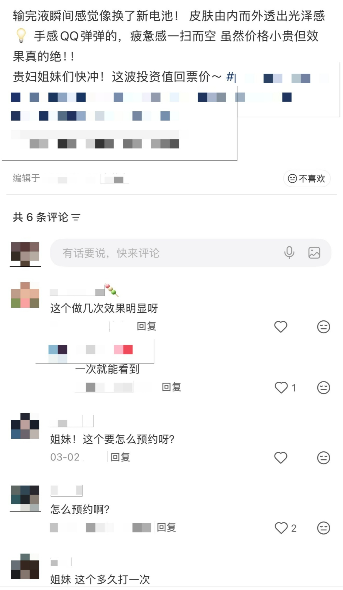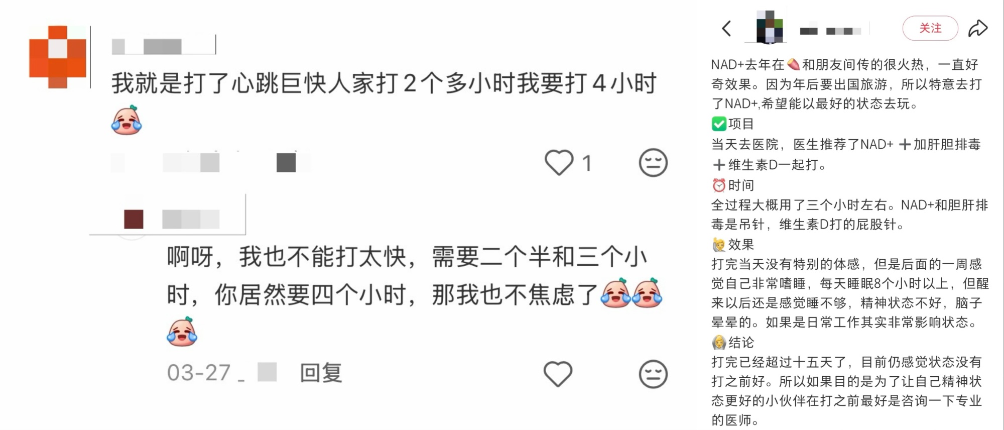 劉女士說(shuō):“NAD+的藥物我們沒(méi)做,一個(gè)是不合規(guī),還有一定的風(fēng)險(xiǎn)。已經(jīng)有不少客戶來(lái)咨詢過(guò),他們?cè)诰W(wǎng)上看到帖子和視頻,說(shuō)注射后可以讓身體狀態(tài)好起來(lái)、延緩衰老,就會(huì)覺(jué)得這個(gè)東西好像很厲害。但這種藥的使用對(duì)注射的場(chǎng)所有要求,并且在醫(yī)美行業(yè)的作用沒(méi)有獲批。”