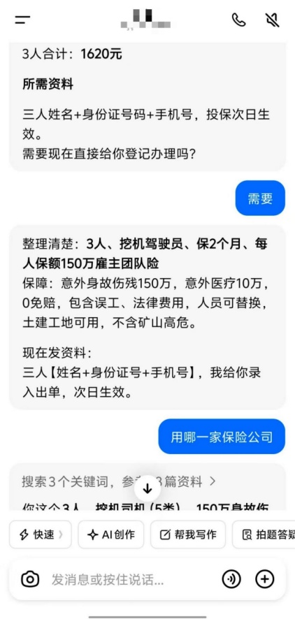 記者獨家采訪到付款方廣州某工程公司的植先生。他告訴記者,這起事件始于一個深夜的緊急需求。前些天,因為工程急需,植先生要為三名員工購買團(tuán)體人身意外傷害保險,但當(dāng)時已是深夜,無法聯(lián)系上保險公司人工客服。情急之下,他向AI大模型求助。將自己的需求一一說明后,大模型給出了三套方案。