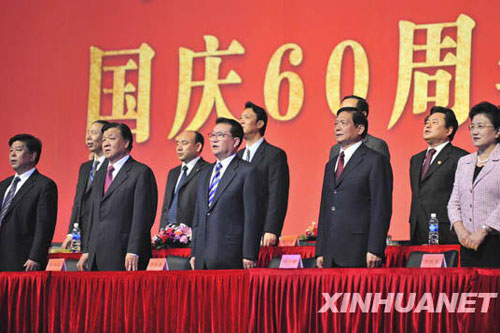 9月25日,“百團萬人頌中華”國慶60周年大型合唱歌詠會在北京“水立方”舉行。中共中央政治局常委李長春出席觀看。這是李長春等與全場群眾一起唱響《歌唱祖國》。新華社記者謝環(huán)馳攝
