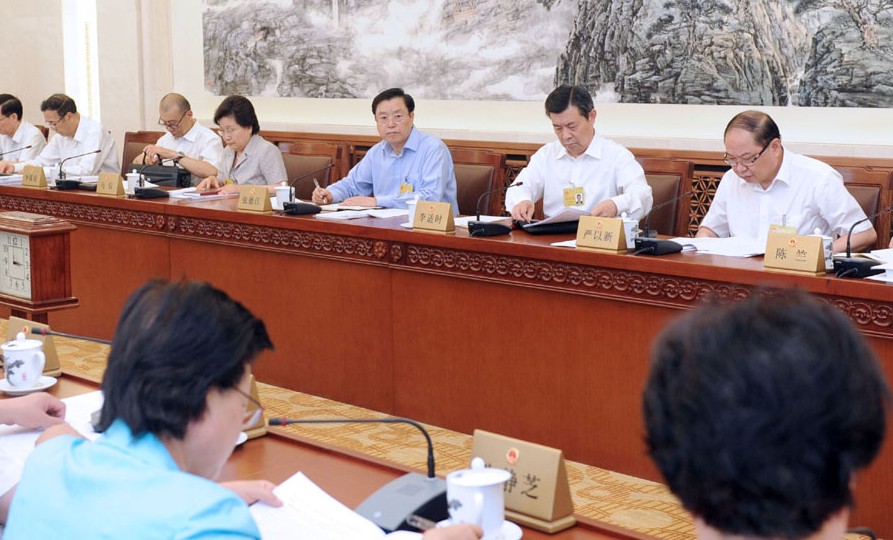 6月26日,十二屆全國人大常委會第三次會議分組審議特種設(shè)備安全法草案,審議文物保護(hù)法等12部法律的修正案草案。張德江委員長參加審議。新華社記者 張鐸 攝