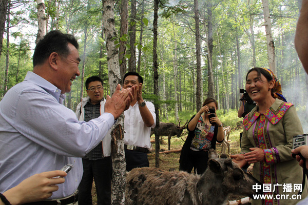 中央人民廣播電臺“傾聽內(nèi)蒙古”采訪團(tuán)到森林中的獵民點(diǎn)進(jìn)行采訪。獵民索玉蘭飼養(yǎng)著100多頭馴鹿。圖為玉蘭唱起了當(dāng)?shù)氐拿窀,獲得了大家的贊賞。 中廣網(wǎng)記者寧靜_攝