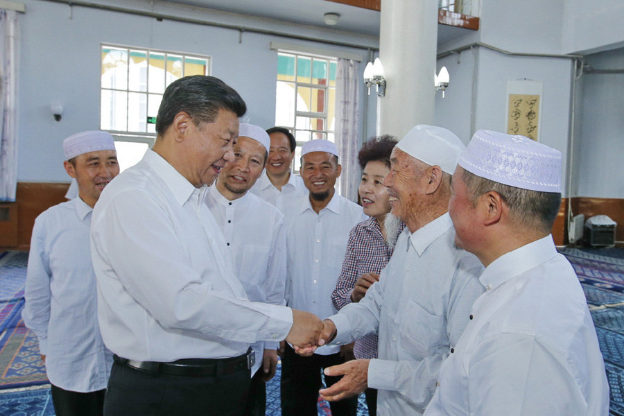 習(xí)近平總書記19日上午來到寧夏回族自治區(qū)銀川市新城清真寺了解宗教活動開展情況。在禮拜大殿,習(xí)近平與寧夏伊斯蘭教界人士親切交流,通過他們向廣大穆斯林群眾致以親切問候和良好祝愿。