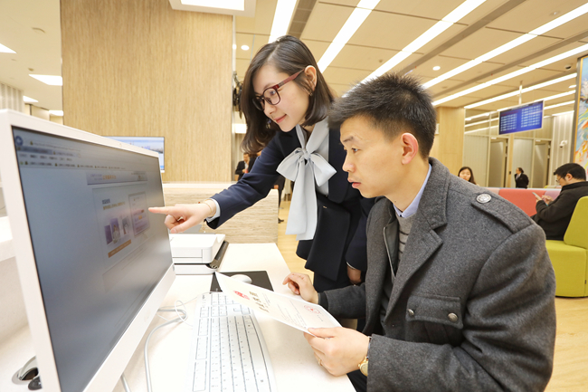 在上海浦東國(guó)際人才港,人們?cè)谵k理相關(guān)業(yè)務(wù)。(黃日閱 攝)