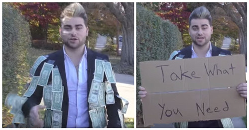 網(wǎng)絡紅人寇比·皮爾辛近日在YouTube上發(fā)布了他最新的“街頭社會實驗”影片。影片中,他穿著貼滿現(xiàn)金的西裝,舉著“需要多少就拿多少”的牌子在紐約街頭走動,測試路人反應,結果怎樣呢?