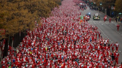圣誕老人入城了!據(jù)外媒報(bào)道,西班牙首都馬德里近日舉行第4屆圣誕老人賽跑,超過1萬人打扮成圣誕老人參加。比賽隊(duì)伍沿著西甲球隊(duì)皇家馬德里主場(chǎng)班拿貝球場(chǎng)的街道跑5.5公里,場(chǎng)面壯觀,人數(shù)更打破去年5173人的吉尼斯世界紀(jì)錄。