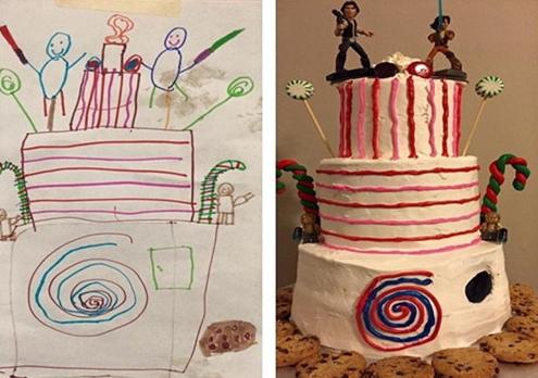身為面包師傅的母親依循著孩子的鉛筆畫,在蛋糕上淋上五顏六色的糖漿,放上棒棒糖及餅干裝飾,蛋糕圖最上方兩個(gè)人物揮舞著激光劍,母親特地放上了《星球大戰(zhàn)》的人物,這個(gè)美味蛋糕一出爐,讓孩子又驚又喜。
