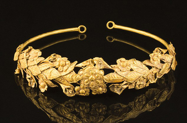 該桂冠是在一個(gè)破舊的紙板盒中被發(fā)現(xiàn)的,距今已約有2300年歷史,由純金制成。它保存完好,樹(shù)葉狀的圖案美麗典雅。因這些桂冠容易破損,在古希臘時(shí)期,只有在慶典、運(yùn)動(dòng)會(huì)或是藝術(shù)比賽上才會(huì)將其拿出。