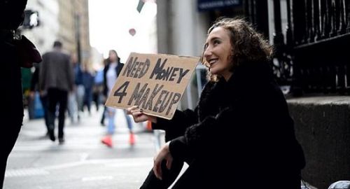在大多數(shù)人的印象中,乞丐通常是衣衫破舊、蓬頭垢面的,假扮乞丐得照著這個(gè)外形路數(shù)走,再編造一個(gè)苦情故事才能博得同情。一個(gè)穿得光鮮靚麗的女子為買(mǎi)化妝品而乞討,能要到錢(qián)嗎?