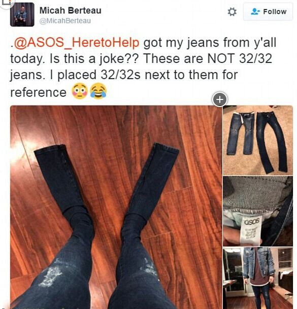 近日,美國加利福尼亞州的顧客邁卡?伯拖在網(wǎng)購時買到一條超長牛仔褲。隨后,他在“推特”上發(fā)布了普通與超長牛仔褲的對比照片及穿上后的效果照片,引發(fā)眾多網(wǎng)友熱議。