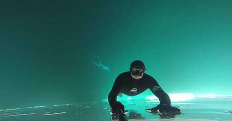 日前,加拿大魁北克省42歲的自由潛水員馬蒂厄·維萊加斯,在沒有任何呼吸裝備的條件下,進(jìn)行了一次冰下潛水,并用其水下相機(jī)記錄了這一過程。在整個(gè)過程中,他不僅“穿過”一架沉沒的飛機(jī),還坐在了一艘潛水艇上,可謂十分炫酷。